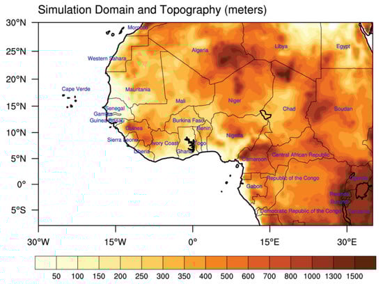 We utilized a large ensemble of high-resolution regional climate model (RCM) simulation over a West African domain (Figure 1) using the Regional Climate Model version 4 (RegCM4; [46]). In this study, we utilized the RegCM model version 4.3 (RegCM4.3, hereafter RegCM4).The RegCM4 modeling system offers various physics scheme options, which are described and summarized in [46]. For our experiments, the selected physics options are (i) the scheme of Kiehl et al. [47] for the radiation, (ii) the Community Land Model version 4.5 (CLM4.5) [48] for the representation of the interactions between land-surface processes and the atmosphere, (iii) The Massachusetts Institute of technology cumulus convection scheme of Emanuel [49,50], (iv) the scheme of Zeng et al. [51] to represent the fluxes from the ocean, and (v) the SUBgrid EXplicit (SUBEX) moisture resolvable scale precipitation scheme of Pal et al. [52]. The aforementioned setup for the RegCM4 model setting is similar to those described and used in Sylla et al. [44], Kebe et al. [45], and Tall et al. [53]. For more details regarding the RegCM4 configuration, for brevity the reader is directed to both Sylla et al. [44] and Kebe et al. [45].