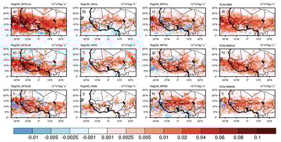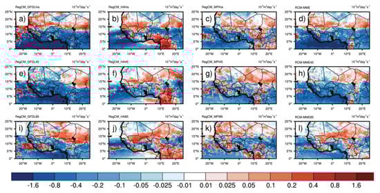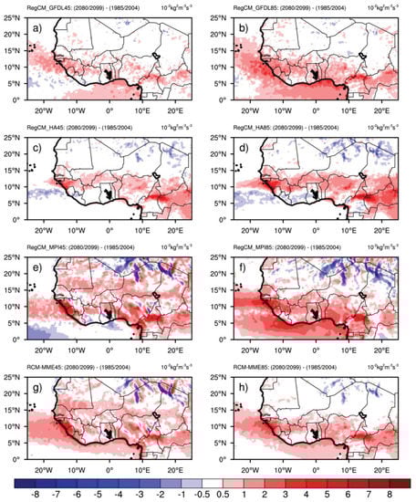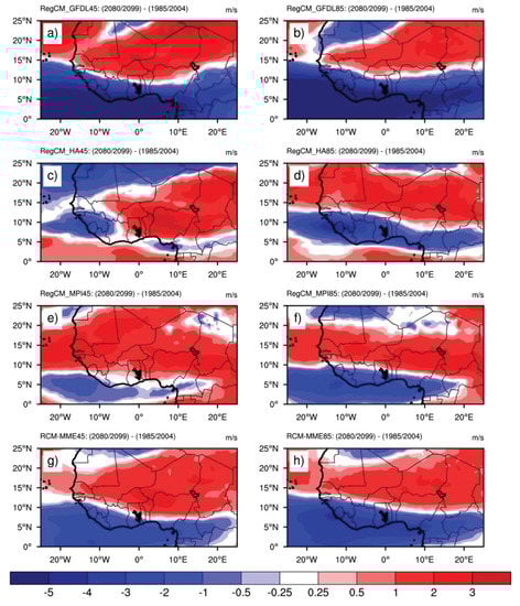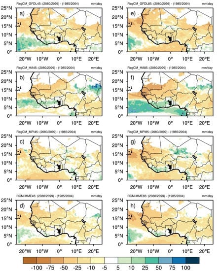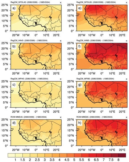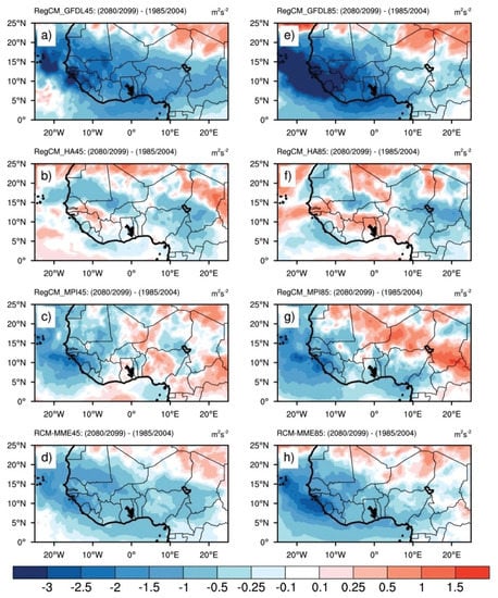 By the end of the 21st century and under both scenarios, all RegCM4 experiments predict a clear increase in 2m-temperature but with different magnitudes over West Africa. The RCP8.5 scenario exhibits larger warming, in the range of 3–8 °C, over most parts of the West African region. These results are in line with previous findings [42,43,44] and indicate an increase of latent heating, which induces a weakening of inland moisture convergence. We found that the moisture convergence lowering is more pronounced over the Savanna-Sahel region, albeit with a different magnitude/sign and impact on the precipitation changes over West Africa. For instance, both scenarios show a considerable reduction of monsoon precipitation (more than 25%) with more extended drying conditions in the western Sahel region, while parts of the Guinea Coast experience about 10% of positive precipitation change.