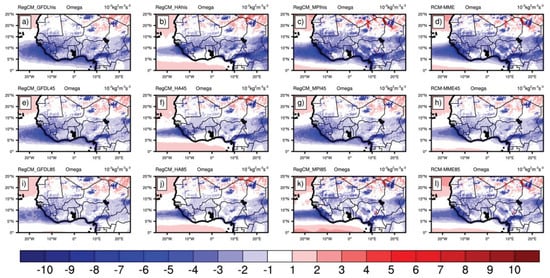 Seasonal mean of vertical velocity (unit: Pa/s) for JJAS from (a) RegCM_GFDLhis, (b) RegCM_HAhis, (c) RegCM_MPIhis, (d) RCM-MME, (e) RegCM_GFDL45, (f) RegCM_HA45, (g) RegCM_MPI45, (h) RCM-MME45, (i) RegCM_GFDL85, (j) RegCM_HA85, (k) RegCM_MPI85, (l) and RCM-MME85.