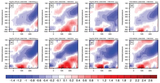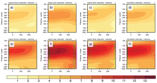 In this section, we focus on the projected changes of the AEJ in terms of position and strength through the simulation of meridional temperature gradients. The surface temperature gradient plays a major role in the genesis and maintenance of the AEJ in the lower and middle troposphere. For instance, the strength of the AEJ depends strongly on the position and intensity of meridional temperature gradient [2,4,67,68]. As seen previously, the weakening of the vertical motion and the increase of potential temperature in the upper level induce a redistribution of heat, which likely affects the AEJ structure. Figure 7 displays the latitude–height cross sections of projected changes in meridional temperature gradient averaged between 10°E and 20°W under theRCP4.5 (Figure 7a–d) and the RCP8.5 (Figure 7e–h) scenarios.