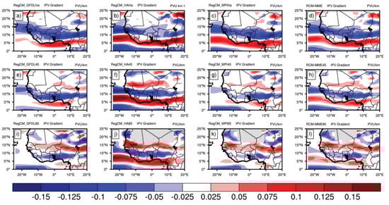 Seasonal mean of meridional isentropic potential vorticity (IPV) gradient (PVU/km) for JJAS from (a) RegCM_GFDLhis, (b) RegCM_HAhis, (c) RegCM_MPIhis, (d) RCM-MME, (e) RegCM_GFDL45, (f) RegCM_HA45, (g) RegCM_MPI45, (h) RCM-MME45, (i) RegCM_GFDL85,(j) RegCM_HA85, (k) RegCM_MPI85, and (l) RCM-MME85.