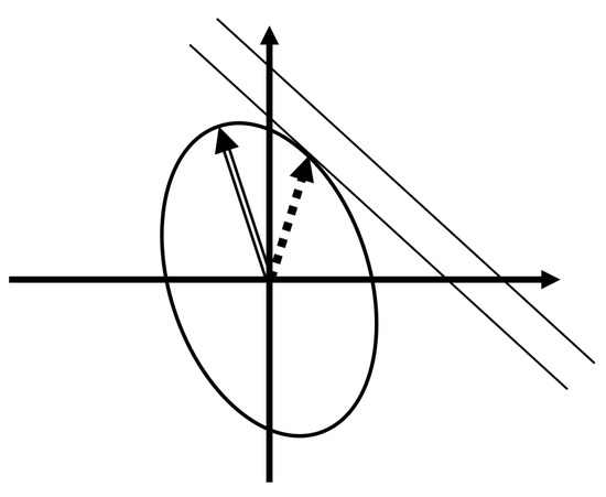 PCA and DCA spatial patterns in a space with two dimensions. The axes are the two dimensions, which might be, for instance, rainfall anomaly amounts at two locations. The diagonal lines then show lines of constant total rainfall anomaly. Assuming that the two variables are bivariate normal distributed in space with a weak negative correlation the ellipse shows a contour of constant likelihood (probability density) or constant Mahalanobis consistency, with higher likelihoods (higher Mahalanobis consistency, lower Mahalanobis distance) inside the ellipse. Each point in this two dimensional space represents a spatial pattern, consisting of a single realisation from the bivariate normal, made up of rainfall anomaly values at the two locations. The tip of the double arrow gives the rainfall anomaly values for the first PCA spatial pattern, while the tip of the dotted arrow gives rainfall anomaly values for a scaled version of the first DCA spatial pattern. In this case the two patterns are scaled to have the same likelihood, as we can see from the fact that they both just touch the ellipse. The PCA spatial pattern has larger explained variance, while the DCA spatial pattern (which is the point on the ellipse with the greatest total rainfall anomaly, by definition) captures a greater total rainfall anomaly, and so is more relevant for understanding extreme rainfall totals.