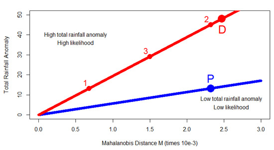 The total rainfall anomaly and Mahalanobis distances for the PCA and DCA patterns shown in Figure 1 and Figure 3, and for various scalings of these patterns. The large blue circle “P” corresponds to the first PCA pattern. The large red circle “D” corresponds to the first DCA pattern. The blue line corresponds to possible scalings of the first PCA pattern. The red line corresponds to possible scalings of the first DCA pattern. The interesting properties of DCA arise from the fact that the red line is above the blue line. The small red circle labelled “1” corresponds to a scaling of the first DCA pattern that reduces the rainfall anomaly to the same level as that of the first PCA pattern. The small red circle labelled “2” corresponds to a scaling of the first DCA pattern that reduces the Mahalanobis distance to the same as that of the first PCA pattern. The small red circle labelled “3” is an example of a scaling of the first DCA pattern in between the scalings used for 1 and 2. The pattern corresponding to point 3 has both a larger rainfall amount and a lower Mahalanobis distance (and hence higher likelihood) than the first PCA pattern.
