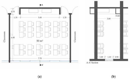 Multipurpose classroom according to Andalusian design standards: (a) Plant with windows, doors, and furniture standard distribution. (b) A-A’ vertical section.