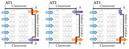 where n50,AT1 is the infiltration rate at 50 Pa in protocol 1, in h−1; n50,AT2 is the infiltration rate at 50 Pa in protocol 2, in h−1; n50,AT3 is the infiltration rate at 50 Pa in protocol 3, in h−1; n50,t is the infiltration rate at 50 Pa through the envelope and doors of the room, in h−1. V50,DoorA is the air leakage rate at 50 Pa which circulates through door A, in m3/h; V50,DoorB is the air leakage rate at 50 Pa which circulates through door B, in m3/h; V50,env is the air leakage rate at 50 Pa which circulates through the envelope, in m3/h; V is the internal volume of the room, in m3.
