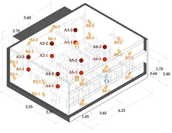 The 3-D array of measurement points superimposed in a multipurpose classroom. Red dots show values at 0.6 m, dark red dots at 1.7 m, orange dots represent measures in the room’s envelope, and blue dot is the window.