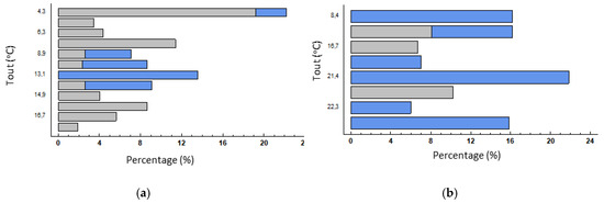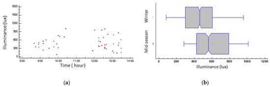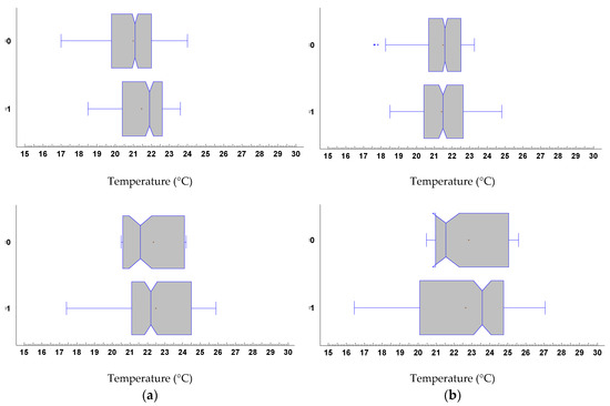 The measured interior air temperature (Ta) ranged between 17.8 and 22.7 °C during winter season (Table 5), with the lowest mean temperature values obtained for the case studies with closed windows, especially when inner doors were open, with values of 20 °C. It can be related with the outdoor conditions, given that the lowest outdoor temperature values (Ta, outdoor) were measured for classrooms with closed windows and open inner doors. In addition, 8 of the case studies had the windows open during winter, which can mean that there was a bad regulation of the heating system and the heat excess had to be dissipated, or that the students considered that they had to ventilate the classroom due to a poor environment perception. Indoor air temperature in midseasons was oscillating around 22.4 °C, without a direct relation with window operation. Although winter time temperature expectations range between near 20–22 °C to 20.4–22.6 °C if windows are open (central quartile lower and upper values), this band nearly doubles in middle season, when temperatures from 20.6 to 24 °C may be expected (21.1 to 24.5 °C if windows are open). A quartile distribution plot for indoor thermal parameters, air temperature, and operative temperature is proposed in Figure 4. It is noteworthy to highlight that there was a statistical significance between seasons in a windows-state with independent behavior aspect that was verified through test of comparison of samples, F-test for the variance and a K-S (Kolmogórov-Smirnov) for the distributions of probability with p-values under 0.05 in all the cases.