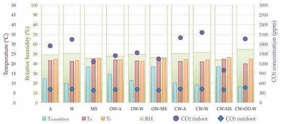 These values were analyzed according to seasons (winter, W, and midseasons, MS) and windows’ and doors’ operation (open windows, OW, closed windows, CW, open door, OD). In this way, 26 classrooms (55% of the case studies) had the windows closed during the measurement period, with 23 of these during the winter session, and 21 had the windows open (45% of the case studies), with 11 of them during the winter period. No intervention by the researchers was made to modify classroom-state, allowing us to gather operational actual conditions.