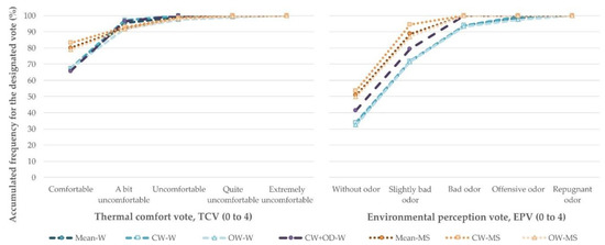 - The occupant’s environmental perception vote (EPV) from 4 (repugnant odor) to 0 (without odor).