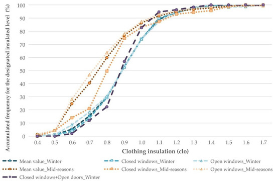 The clothing insulation values worn by the occupants were obtained from the surveys and subsequently quantified according to EN ISO 9920 [67] and EN ISO 7730 [23], considering the corrections proposed by Havenith et al. [68] for seated occupants, with a thermal insulation of clothing (Icl) lower than 1.84 clo and air velocities under 0.15 m/s.