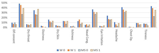 In this way, previous studies in European schools analyzed the link between the IAQ conditions, obtained through measurements of CO2, PM, and volatile organic compounds (VOCs), with health questionnaires made by parents, spirometry, exhaled nitric oxide tests, and asthma tests with medical kits [29,38]. This approach required complex equipment and tests, and were not directly related to on-site symptomatology but to long-term symptom development, as it was gathered in housing studies [39]. Users’ perception of environmentally related symptoms had a direct potential to draw an actual comfort situation, not only determined by room-physical conditions but to occupants’ responses, as was shown in [40,41,42,43], also with the capacity to identify individual answers, such as those related to gender or emotional situation [44,45,46].