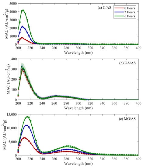 Representative sets of absorbance spectra over six hours of aging, compared against fitted base case model outputs, are shown as points and shaded regions in Figure 1. MG/AS solutions were observed to be the most chromophoric, followed by G/AS and GA/AS solutions. All three solutions exhibited an asymmetrical peak in the 200–220-nm region, with a smaller peak between 260 nm and 290 nm. Generally, solution absorbance increased with solution age, with MG changing the most and GA changing the least over the measured timeframe. The absorbance locations and relative observed magnitudes in this study were shown to be consistent with previous studies that have explored comparable CVOC/AS reaction systems [17,18,19,20,21].
