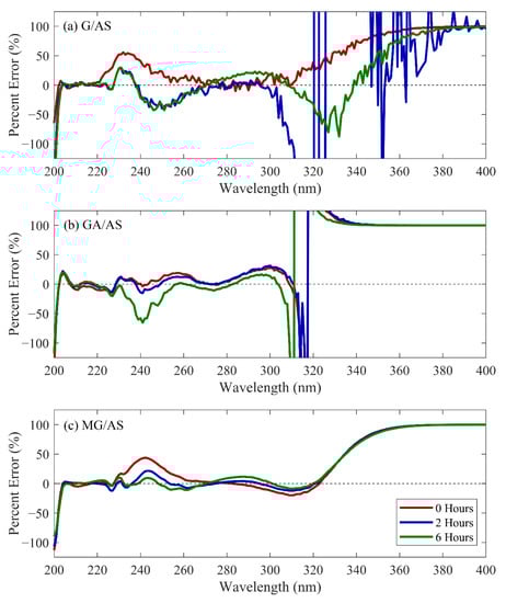 The estimated MAC for three-curve models for the three tested reaction solution systems are represented as solid lines in Figure 1. The percentage errors from the measured datasets for these outputs are shown in Figure 2. The percentage error and NRMSD information for selected simulation conditions are summarized in Table 1. Complete NRMSD data and percent error information for all combinations of CVOC/AS reaction systems and tested models can be found in Tables S1 and S2. The agreement between observed and modeled MAC was found to be high in the region between 205–300 nm, with predicted values remaining within 65% for three-curve models of all tested CVOC/AS systems and reaction times. Higher relative error was observed at the upper (>300 nm) and lower (<205 nm) bounds of the modeled range, which was attributed to low absolute measured signal and small model-contributing sample size, respectively.