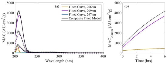 (a) Decomposed, three-curve G/AS spectrum: (a) Across wavelength at 0 h (dotted), 2 h (dashed), and 6 h (solid) of solution aging compared against observations. (points) Shaded regions denote one standard deviation ranges for observed values. (b) Observed MAC at 208 nm (points) compared against the overall MG/AS three-curve model (black) and contributing lineshape functions.