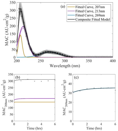 (a) Decomposed, three-curve GA/AS spectrum: (a) Across wavelength at 0 h (dotted), 2 h (dashed), and 6 h (solid) of solution aging compared against observations (points). Shaded regions denote one standard deviation ranges for observed values. (b) Observed MAC at 208 nm (points) compared against the overall GA/AS three-curve model (black) and contributing lin eshape functions. (c) Observed MAC at 269 nm (points) compared against the overall GA/AS three-curve model (black) and contributing lineshape functions.