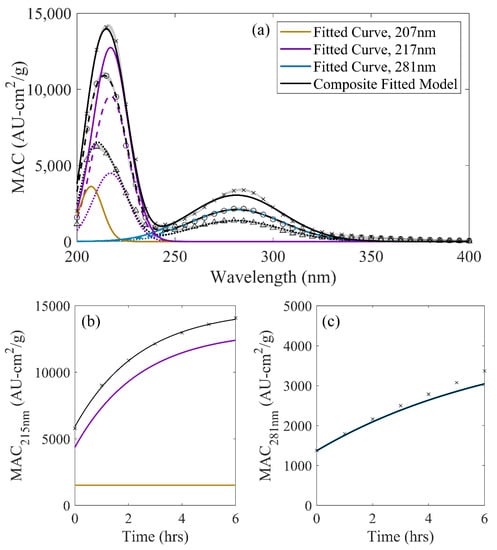Although it is possible to model all three Gaussian coefficients as having time-dependent behavior (resulting in a total of 9n variables), overfitting spectra potentially increases computational load and decreases physically grounded comparability across different modeled systems. From previous literature exploring the chromophoric properties of the CVOC/AS dark chemistry system used in this work, peak spread and approximate locations were found to remain roughly constant [17,20,21,25,28]. Therefore, applying Equation (3) to the magnitude term of Equation (2), a time- and wavelength-dependent function for MAC with 5n fitted coefficients was developed: