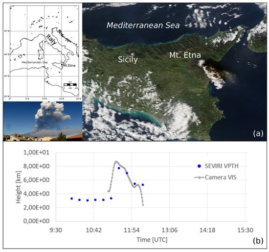 The sustained volcanic column generated during the peak in activity was recorded by the ground-based visible (VIS) camera of INGV-OE located in Catania (27 km from the summit craters), Figure 1 Panel (b). The camera had been calibrated to estimate column height [] and INGV-OE reported a maximum height of 8.5 km asl at around 11:30. The camera estimates are in agreement with the plume height computed by exploiting the well-established dark pixel procedure applied to the SEVIRI measurements collected during the eruption []. Both estimates show a rapid decrease in column height which reached 5 km asl at around 12:00.