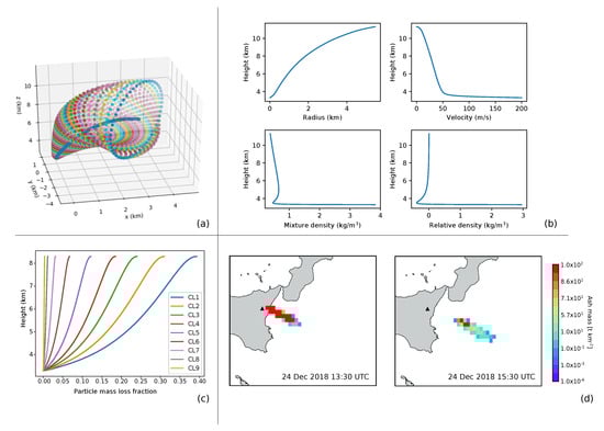 Figure 2 shows an example of the main outcomes of a typical PLUME-MoM&HYSPLIT simulation applied to the Mt. Etna case study. Plume height was set equal to 8300 m asl (i.e., 5000 m above the vent) and we set an eruption duration of 2 h (from 11:30 to 13:30 on 24 December 2018). TGSD is formed by 9 particle classes ranging from −3 to 5 with = 1. Mixture temperature and water mass fractions are 1300 K and 0.03, respectively. Panel (a) shows the 3D structure of the plume as computed by PLUME-MoM, while plume radius, plume velocity, mixture density and relative density are displayed in Panel (b). Please note that we indicate with relative density the difference between the density of the volcanic mixture and the density of the surrounding air. A negative value of the relative density means that the density of the volcanic mixture is lower than the density of the atmosphere and thus the plume is buoyant. Mass fractions of the particle classes lost from the column during plume ascent are shown in Panel (c), where classes are numbered from CL1, corresponding to −3, to CL9, 5. As can be seen from the figure, the coarsest class (CL1) loses 35% of its initial mass during the ascent, while finer classes are transported up to the neutral buoyancy height without losing significant amount of mass. Finally, Panel (d) shows atmospheric ash columnar content (burden) in t km as computed by HYSPLIT at two different time slices.