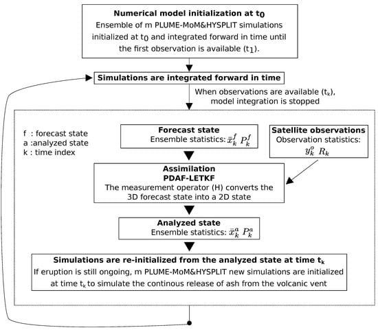 The synergy between VATD models and satellite observations appears to be an effective way to monitor and forecast ash dispersal and deposition. Indeed, some of the limits of satellite retrievals can be overcome by numerical simulations and vice versa. For example, depending on the circumstances, numerical models allow tracking and forecast of volcanic plumes at higher temporal resolution than satellite sensors. This is of value for volcanic risk mitigation, where information on ash location and concentration are needed at high temporal frequency. On the contrary, the properties and distribution of ash particles retrieved from space are a valuable support for the initialization of the numerical models. However, since satellite observations and numerical results are affected by uncertainties, a straightforward combination between the two is not sufficient to reduce the global uncertainty of the system. In this sense, Data Assimilation (DA) is a powerful tool for estimating the best representation of the state of the system including the minimization of the global uncertainty []. DA is widely used and applied in atmospheric and oceanic contexts [,,], while few studies have been dealing with volcanic applications so far. Improvements in ash forecasting by assimilating data from aircraft- and satellite-based measurements have been shown in Fu et al. [,,,,,] and Osores et al. [].