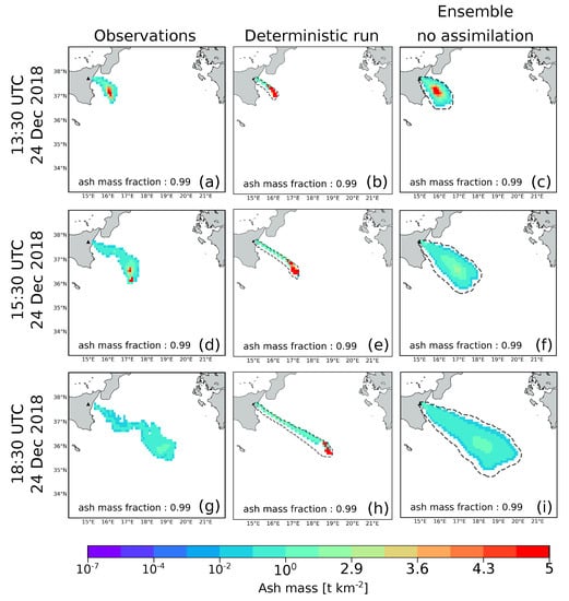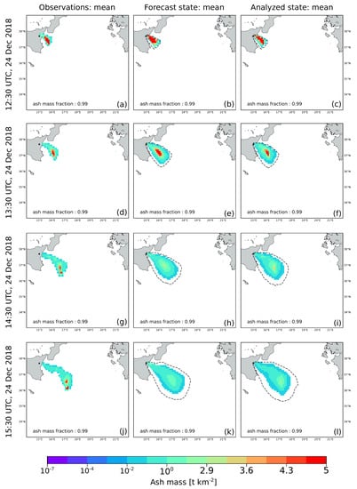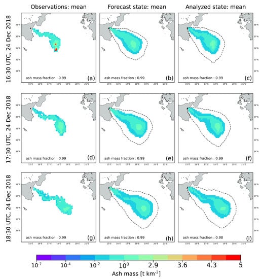 where p is the dimension of the observation vector and is the observation error. Finally, as the assimilation cycles are performed, we tracked the total atmospheric ash mass loading of the observed, forecast and analyzed states.