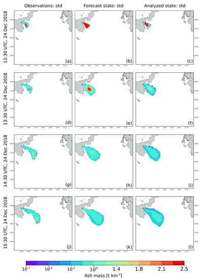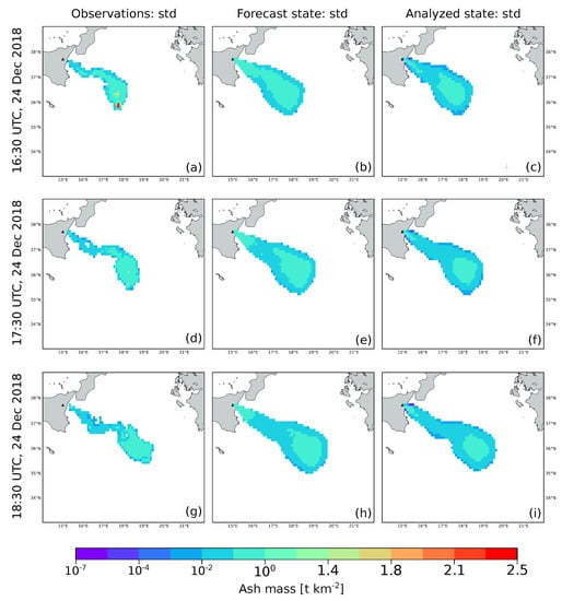 The results of the assimilation procedure are shown from Figure 5, Figure 6, Figure 7 and Figure 8. At each assimilation cycle, three ash states are presented. From the left to the right, these are: the ash cloud as seen from space (Observations), the prediction done by the model (Forecast state) and the result of the assimilation procedure (Analyzed state). The statistics describing each ash state are the mean value and the standard deviation calculated for the ash columnar content of each pixel. For the forecast and analyzed states, these quantities are computed from the ensemble members by applying Equations (1) and (2) (standard deviation is the square root of the covariance). The mean state is displayed in Figure 5 and Figure 6, while the standard deviation in Figure 7 and Figure 8. For the forecast and the analyzed states, ash load (kg) contained in each pixel was integrated over the particle classes and the atmospheric levels to produce 2D maps. Then, ash load was converted into ash columnar content (t km) for comparison with the SEVIRI observations. A concentration cut-off of 0.01 t km was applied to the plot of observations, forecast and analyzed states. Despite the concentration cut-off, 99% of the initial ash loading is still present into the regions plotted in the figures for the measured, forecast and analyzed ash states. It is worth noting that the simulated clouds are bigger than the observed ones. This result is mainly due to the way in which the ensemble was created, which is through perturbations of the wind-field. Changing the way in which the ensemble is generated (e.g., through perturbations of ESPs such as column height or TGSD) or varying the perturbation coefficients (i.e., , , , ) would affect the size and the shape of the simulated cloud. These effects can be seen in the experiments reported in the supplementary material (Figures S1–S25).