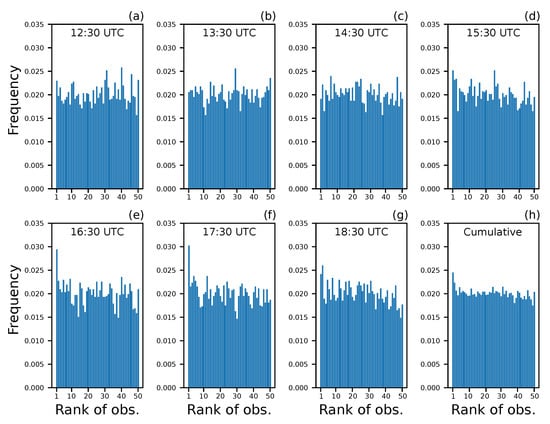 The rank histogram, also known as Talagrand diagram [], is a tool for assessing the reliability of ensemble forecasts. It is used to check whenever the ensemble spread is consistent with the assumption that observations statistically belong to the probability distributions of the forecast ensembles. Thus, for a good forecast, observations are indistinguishable from model forecasts and they can be considered to be members of the forecast distributions. The procedure that we adopted to construct the rank histogram is the following: at each grid point of the computational domain, we ranked the m ensemble members from the lowest to the highest producing bins (the two extremes are included and they are rank 1 and rank ). We identified which bin the observation falls into and we placed the observation in the appropriate bin. We tallied over all the grid points and we created a histogram (the Talagrand diagram). In case two or more ensemble members and the observation have the same value (most commonly 0), we randomly selected which bin receives the count. A flat Talagrand diagram means that observations are indistinguishable from any other ensemble member meaning that the ensemble spread correctly represents the uncertainty of the observations. An U-shaped diagram reflects a poorly spread ensemble, while a Dome-shaped one means that the spread of the ensemble is too large with respect to observation uncertainties. Indeed, in the first case (U-shaped), observations fall too often outside the extremes of the ensemble, while in the second case (Dome-shaped) observations fall too often near the center of the ensemble. An asymmetric histogram means that the ensemble contains bias. It is worth noticing that a flat histogram is not a necessary condition for a reliable ensemble, but it only means that the probability distribution of the observations is well represented by the ensemble spread [].