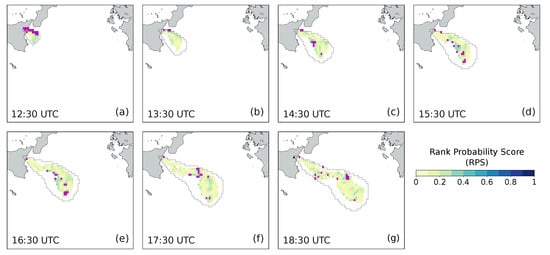 While the rank histogram gives information on the ensemble for the whole domain, we also computed the Rank Probability Score () to analyze the ensemble results on the single observation points []. measures the quadratic distance between the forecast and the observed probability distributions computed for a specific point of the domain:
