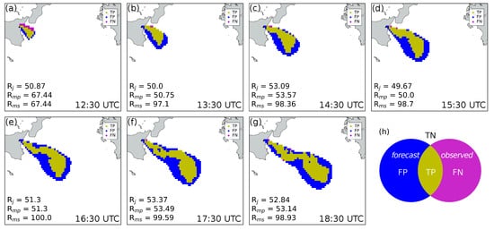 Model performance has also been evaluated through three indices named Jaccard similarity coefficient (), also called Threat Score or Critical Success Index [], model precision (), also called Positive Predictive Value, and model sensitivity (), also called Hit Rate or True Positive Rate. For the description of these indices we used the notation of Charbonnier et al. []. To calculate , and , we considered the number of False Positives, False Negatives, True Positives, and True Negatives resulting from the comparison of the forecast state (simulation results) with the observed state. In our case, pixels where ash is both numerically predicted and observed are denoted as True Positives (TP), while pixels where ash presence is simulated, but not observed, are called False Positives (FP). False Negative (FN) indicates that a pixel is numerically ash-free, but the presence of volcanic ash has been detected from space. Finally, ash-free pixels resulting from both model simulations and observations are denoted as True Negatives (TN).