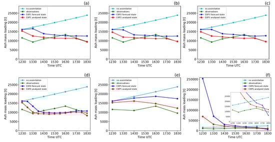 The remaining input parameters were kept constant for all the experiments and are summarized in Table 2. These parameters define the properties of the eruptive mixture used to initialize PLUME-MoM and the setting parameters of the computational grid on which HYSPLIT simulations are performed. For the present application, particle aggregation was not considered and HYSPLIT simulations were done using the puff approach. However, in case of Mt. Etna eruptions, ash aggregation is not dominant []. It is worth noting that the same TGSD was used as input for all the experiments. Experiments from 1 to 5 aimed at testing the data assimilation procedure for uncertainties on meteorological conditions and for different observation sampling intervals. Since ESPs, including TGSD, are kept constant for all the experiments, the three particle classes which are assimilated carry the same fraction of the total ash mass loading for all the experiments (from 1 to 5). On the contrary, EXP6 was designed to test the effects that unknown ESPs (in this case column height) have on the assimilation results. A variation in column height determines a variation in mass eruption rate, and thus in the ash mass loading carried by the assimilated particle classes. Previous studies show that plume height is weakly dependent on the initial TGSD []. The reason is that the large amount of air entrained in the volcanic column reduces the contributions of the solid fraction to the overall dynamics [,]. Moreover, we are not interested in reproducing the deposit, which is more strongly related to initial TGSD, but we only look at the dispersal patterns of the fine ash. For these reasons, the choice that we made on initial TGSD determines the fraction of the total ash loading, which is assimilated only without major repercussions on the dynamics of the volcanic column.