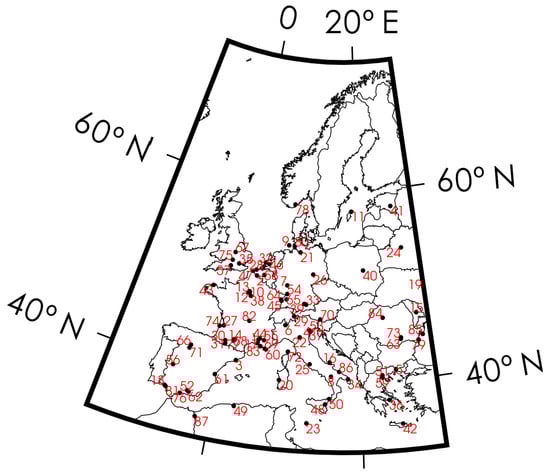 Medium AOD values are found in the many European cities as Belsk (40, Poland); Kyiv (19, Ukraine); Mainz, Leipzig, and Karlrsuhe (7, 26, 52, Germany), Paris metropolitan area (10, 12, 13, France); southwest of Great Britain and Benelux cities and all the cities bordering the Mediterranean. These levels could also be attributed to high aerosol loads from anthropogenic origin, since these areas are far from natural influences. However, in more southern locations like the Mediterranean, AOD675 levels could also come from recurrent desert dust outbreaks [,].