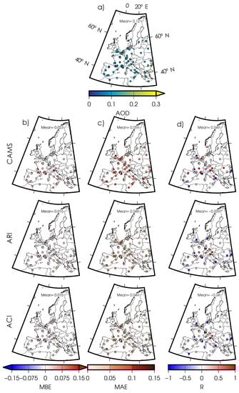 Figure 2a displays average monthly AERONET AOD675 during the target period. Temporal and spatial mean of observed AOD675 is 0.12. Stations with lower AOD675 values (below 0.05) are located in rural areas as Autilla (66, Iberian Peninsula); Pic de Midi (31, Pyrenees); Aubiere (82, France); or Davos (29, Switzerland). This is an expected fact since these are background stations, located principally in rural areas where lower aerosol loads from anthropogenic origin are expected. A particular station is Bordeaux (27, France) with mean AOD675 values of 0.04 as a consequence of the high precipitation frequency fluxes over this area []. On the other hand, the highest AOD values (above 0.20) were found in Tarbes (30, France); Gloria (85, Romania); and Rossfeld (45, Germany) because these areas present an important anthropogenic pollution, especially associated to black carbon [,].