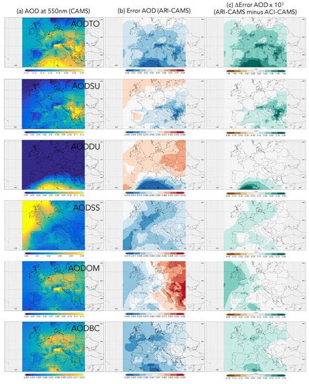 (From top to bottom: AODTO, AODSU, AODDU, AODSS, AODOM, AODBC). (a) CAMS reanalysis climatology of AOD at 550 nm. (b) Error (bias) of the simulation for the base case and (ARI). (c) Improvement of the error with respect to the base case simulation when including ACI. A positive number, represented by green colours, indicates a reduction of the absolute error in ACI simulations with respect to the base case.