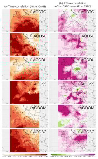 Apart from AODTO, scientific literature is much more limited when assessing chemical components of the AOD. In the case of AODSU, the underestimation found in ARI-base case could be related to two causes: (1) the pervasive tendency of regional models to be geographically biased by strong winter underestimations of sulphate concentrations at eastern European locations (it is widely known that the winter underestimation of sulphate is a common issue in most models that operate over Europe, which represent a direct couplet of sulfur chemistry with photochemistry) []; and (2) the fact that sulphate formation in the modelling systems is often limited by oxidant availability []. With respect to the AODOM, the inclusion of a complex organic aerosols mechanism in models (such as the mechanism used here) leads to a better agreement over certain areas over the sea (for instance, over the Atlantic ocean, as observed here in our simulations) but leads to overestimates of OM in other regions [].
