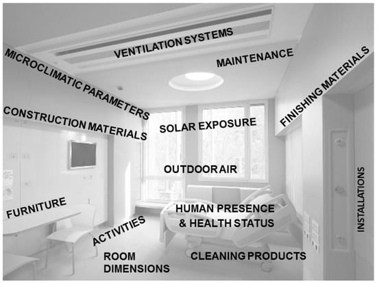 In this evolutionary context, there has been growing attention to indoor air quality’s issue in healthcare facilities, which, in order to satisfy primarily the requests of patients, healthcare users and workers, administrative and non-administrative staff, etc., have been affected to a series of new adjustments and design approaches (i.e., configuration and rationalization of spaces and flows, the use of specific products and materials, etc.) [,], structural and functional actions (i.e., requalification, restructuring, energy efficiency improvement, etc.) [], engineering plants’ system (i.e., optimizing the performance of the centralized heating and cooling systems, energy performances, etc.), [] and management strategies (i.e., the correct daily management of the ventilations systems, the reduction of costs, accounting for consumption, etc.) [], with the aim of expanding the services supplied, the quality of healthcare services, obtaining greater organizational and working flexibility, and attempting to reduce the economic costs of healthcare facilities []. Gola et al. have highlighted the factors that mostly affect a healing space, as Figure 1 synthetizes [].