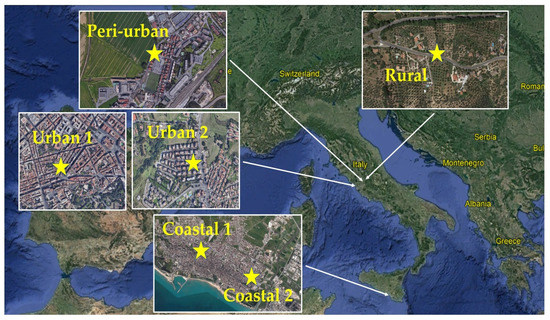 Sampling sites selected for the present study are located as specified in Figure 1: two urban sites (Rome), a peri-urban and a rural site in the vicinity of Rome (respectively 30 km and 40 km from the city center), two sites at a coastal location (Gela, Sicily).