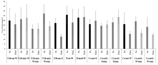 By comparing the site-specific concentrations (squared histograms), it can be observed that the simultaneous measurements (flagged as “sim”) made at urban and coastal sites during winter, resulted in very similar concentrations (21 and 24 µg/m3 at Urban1-Wsim and Urban2-Wsim; 17 and 15 µg/m3 at Coast1-Wsim and Coast2-Wsim), while a slightly higher difference was observed in the case of simultaneous summer sites (respectively 26 and 34 µg/m3 at Coast1-Ssim and Coast2-Ssim).