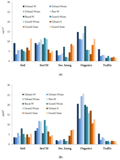 The determination of ions, macro-elements, EC and OC allowed the grouping of these species into five macro-sources of PM: Soil, Sea, Secondary inorganics, Traffic and Organics. The algorithm used to estimate these five macro-sources has been extensively discussed in previous publications [19,20]. Briefly, Soil contribution, originated by both soil erosion or road dust re-suspension is calculated by summing the concentrations of crustal elements as metal oxides (Al, Si, Fe, insoluble K, Mg and Ca, magnesium and calcium carbonates. Depending on the location and season, Sea is calculated by summing Cl− and Na+ multiplied by 1.176 or by multiplying Na+ concentration by 3.27, in order to include other sea-salt components. Secondary inorganic species are determined as the sum of NH4+, NO3− and non-sea-salt SO42−; road Traffic is calculated as the sum of elemental carbon plus an equivalent amount (multiplied by 1.1) of organic carbon that includes the contribution of primary organic carbon adsorbed on particles’ surface. Organics, which include both secondary and primary organic components, are constituted by the remaining organic matter.