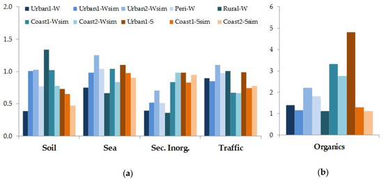 Average indoor-to-outdoor concentration ratios calculated for Soil, Sea, Secondary Inorganics, Traffic (a) and Organics (b).