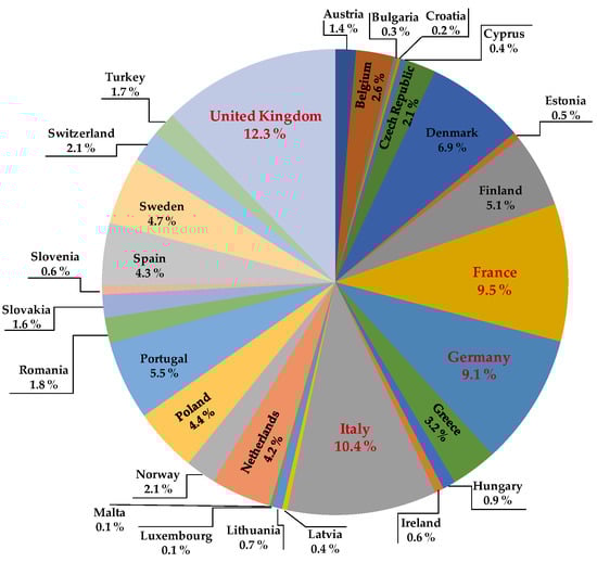 Percentage of country contributions to the total amount of publications on indoor air quality (IAQ) in Europe from 2000 to 2020. (Source: Scopus, search: 19 January 2020); includes Norway, Switzerland, Turkey, and the UK, which is to be expected to leave UE on 31 January 2021.