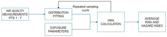 The risk contribution of halocarbon emissions from hazardous waste landfills was evaluated through the application of a health risk analysis (HRA) approach, considering the exposure of possible workers operating on the site. The considered case study was the Barricalla landfill, located close to the town of Turin, northern Italy. As demonstrated by previous research activity on HRA, particular care must be addressed to the definition of the representative pollutant concentration levels, especially when exposure to multiple chemical substances is evaluated [21]. Considering only the average or maximum of the observed concentrations might not be, in some cases, representative of the effective long-term exposure of workers. This is especially valid if fugitive emissions from landfills are considered, where emissions depend on variable factors and sources. If an adequate number of observations is available, the analysis of the probability distribution of measured concentrations and the application of Monte-Carlo methods could provide support in this sense. For this reason, in our study, the calculations of HRA were preceded by an analysis of the concentrations of the chemical species that were measured on site. Data of the ambient concentration of pollutants recorded in 7 sampling points of the study site in the period 2016–2017 were elaborated to find the best fitting probability distribution. One distribution curve per pollutant species was defined. These curves were then used to generate large vectors of the estimated concentration values. Cumulative HRA was then calculated repeatedly using vectors of the estimated concentration values as an input, as described in the following sections. The scheme of the operating model used in this study is reported in Figure 1.