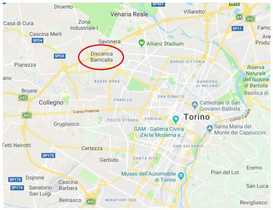 The studied area is situated northwest of Turin, close to an industrial area and the town ring road (Figure 2 and Figure 3). The Barricalla landfill has a comprehensive area of 150,000 m2 divided into 5 lots. The area previously housed a gravel pit of about 600,000 m3, used mainly for the extraction of raw materials for the construction of the Turin ring road. The Barricalla landfill was inaugurated in 1988; lots 1 and 2 have been exhausted and closed. Lot 4 and lot 3 were declared terminated in April 2017 and July 2018, respectively. Recently, the new lot 5 was built, which can accommodate 508,850 m3 of wastes.