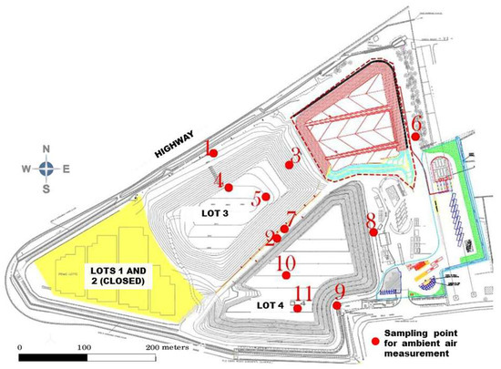 To define the most representative values of the pollutant concentration to which landfill workers are exposed, the data collected from the ambient air monitoring systems were analyzed to define their probability distribution. Monthly concentration values recorded in the years 2016 and 2017 in lot 3 (i.e., the period of full operation of this lot) were collected. Data of sampling points 1–5, 7, and 10 were considered (Figure 4), for a total of 168 observations for each monitored species. To be conservative, a concentration value equal to half of the detection limit was assigned to the observations where the value was below the detection limit. These data were analyzed with the use of the Distribution Fitter tool of the Matlab software [28]. This tool interactively fits probability distributions to imported data, choosing from 22 built-in probability distributions, or creates a customized distribution. The app displays the fitted distribution over plots of the empirical distributions and the estimated parameters. To evaluate the best fit, the principle of maximum log-likelihood estimates was adopted. One distribution was obtained for each pollutant. These data were used to calculate risk and hazard index (HI) by applying a Monte-Carlo method. A Matlab script was generated to calculate the single and cumulative risk and hazard index based on the equations reported in Section 2.3.