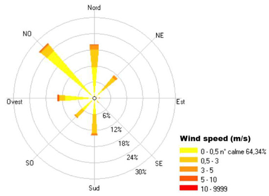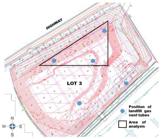 The environmental authorization sets the specifications of the monitoring of the pollutants emitted by the landfill surface (compounds to be measured and frequency of measurements) [22]. Concerning the emissions into the atmosphere, measures on ambient air and landfill gas are done regularly. Ambient air monitoring is measured with a monthly frequency on 11 points (Figure 4) and includes the following compounds: 1,2-dichloroethane, benzene, 1,2-dichloropropane, toluene, ethylbenzene, meta- and para- xylene, styrene, ortho-xylene, 1,2,4-trimethylbenzene, and 1,3,5-trimethylbenzene. The ambient air concentration in lot 3 is measured with a monthly frequency on sampling points 1, 2, and 3 (Figure 4). These points are located at a position of 120° with respect to the center of lot 3. The same method is used in lot 4 (points 7, 8, and 9 of Figure 4). Every 6 months, additional measurements are done in the central position of lot 3 (points 4 and 5) and lot 4 (points 10 and 11). The background concentration is measured every 6 months, at a distance of around 100 m to the limit of the landfill site, in the direction of the nearest receptor (an isolated residential unit). Landfill gas is collected by means of a system of vertical slotted tubes, surrounded by gravel to allow the drainage of gases. Waste typologies conferred in this landfill have very low biodegradability, thus landfill gas production is very limited. The gas is directly vented into the atmosphere. The concentration of pollutants in the vent gas is measured every 6 months. The same chemical species as of ambient air are monitored. The position of the vent pipes in lot 3 is reported in Figure 5. The collection of samples and analysis are done by an external laboratory. The concentration of pollutants in both ambient air and landfill gas are determined according to the EPA TO15/99 method [23]. The meteorology of this area is characterized by low winds, in particular during summer and winter. The average wind distribution in 2015, which is representative of the average conditions, is reported in Figure 6. In this area, during the cold season, pollutant dispersion is mainly regulated by local breeze regimens and soil heat-induced turbulence, which is minimum from December to February. Precipitations are minimum in January.