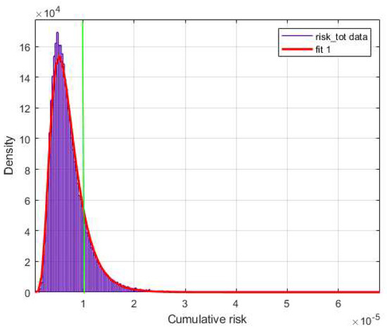 Probability distribution of the cumulative risk resulting from the Monte-Carlo simulations. The green line represents the benchmark value of 10−5.