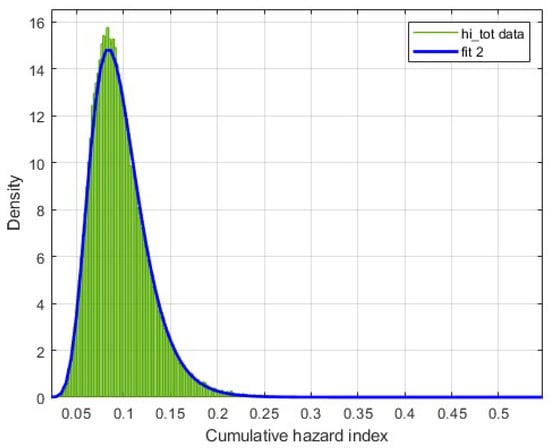 For each pollutant, considering the specific type and estimated parameters of the probability distribution obtained, a large vector (n = 105) of the estimated concentrations was generated. The Matlab script described in Section 2.2 was run repeatedly. In every run, a random value was extracted by the vectors of the estimated concentrations and used as an input for the risk and HI calculation. The following output values were obtained: 1 vector of cumulative risk values, 1 vector of cumulative HI values, 10 vectors (one per pollutant) of single risk values, and 10 vectors (one per pollutant) of single HI values.