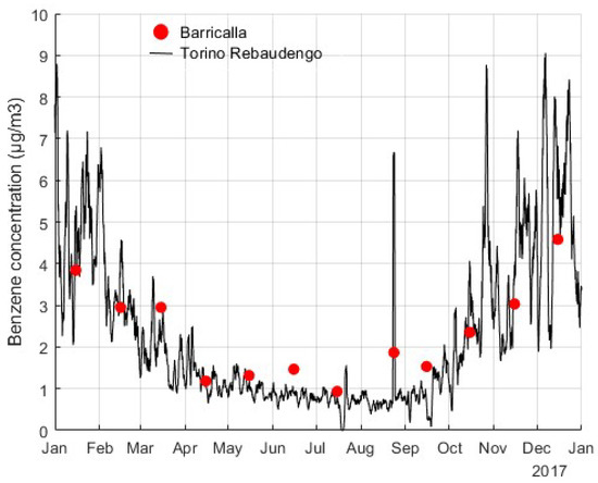 The concentration of benzene in 2017 in Turin. Comparison between the Torino Rebaudengo station and the Barricalla site.