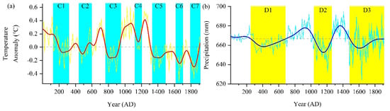 Therefore, seven temperature cycles were defined according to this division scheme (Figure 1a). Each warm and cold phase is listed in Table 1. The duration of all warm periods was 916 years, while cold periods covered 991 years in total. Hence, the warm and cold intervals were relatively balanced compared with the results from Ge et al. [32], in which there were 855 and 1010 years of warm and cold stages, respectively.