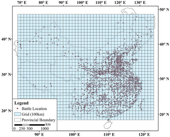In the “Spatial Autocorrelation” tool of ArcMap, the Global Moran’s I statistic, based on feature locations and attribute values [36], was adopted to measure the degree of global spatial autocorrelation (or, roughly speaking, to decide whether there was a spatial cluster effect) for different kinds of war in historical China. Before the tool can be applied, a grid containing the point data of battlefields was generated to facilitate the statistical analysis. In this study, 100 km was selected as the length of each square cell (Figure 2, and the reason for this is detailed in Supplementary Materials). Then, the number of battles in each cell of the grid was counted. Next, the Global Moran’s I statistic was calculated according to