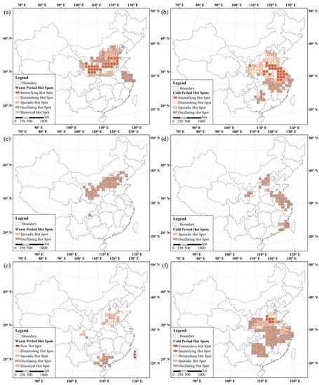 EHSA patterns of all warm and cold periods for three types of war: (a,b) All war, (c,d) agri-nomadic conflict, and (e,f) rebellion. Only significant hot spots (p < 0.05) are shown (the same as Figure 4).