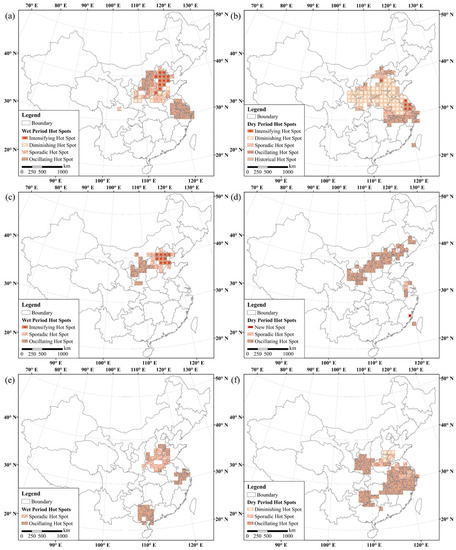The spatial patterns derived from EHSA during all wet and dry stages are visualized in Figure 4. Figure 4a presents the result of all wet periods for all war. Similar to Figure 3a, four types of hot spots (intensifying, diminishing, sporadic, and oscillating) dominated northern China and stretched from eastern Gansu to the North China Plain via Guanzhong, Shanxi, and the Central Plain. They also spread southeastward to the Jianghuai region, the lower reaches of the Yangtze River, and the Yangtze River Delta, but were exclusively covered by oscillating hot spots. Intensifying hot spots were clustered in most of the North China Plain, where battles became increasingly frequent through time. By contrast, in Guanzhong and the eastern Central Plain, the cells that belonged to diminishing hot spots became gradually less hot or not hot in the end, which implies a possible northward movement of battle over time. A striking contrast was observed between the patterns of all wet and dry stages. In Figure 4b, intensifying hot spots shifted to present-day Jiangsu, while the cells in the north mostly turned into diminishing hot spots. Others, such as sporadic and oscillating hot spots, laid in the north (along 40° N) and south (the lower reaches of the Yangtze River) respectively, with a few historical cells scattered around.